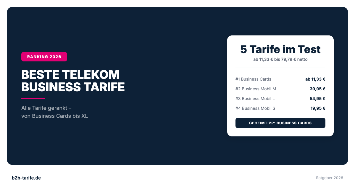 Alle Telekom Business Tarife 2026 im Ranking: Von Business Cards ab 11,33 Euro bis zum XL-Tarif. Klare Empfehlungen nach Unternehmensgröße und Verbrauch.