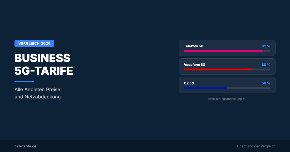 5G ist 2026 in allen aktuellen Business-Tarifen inklusive. Der echte Unterschied liegt in der Netzabdeckung: Telekom führt mit 92 %, Vodafone folgt mit 80 %, O2 liegt bei 50 %. Für Unternehmen in Großstädten bieten alle drei Anbieter nutzbares 5G. Außerhalb von Ballungsräumen ist die Telekom die einzige zuverlässige 5G-Option.