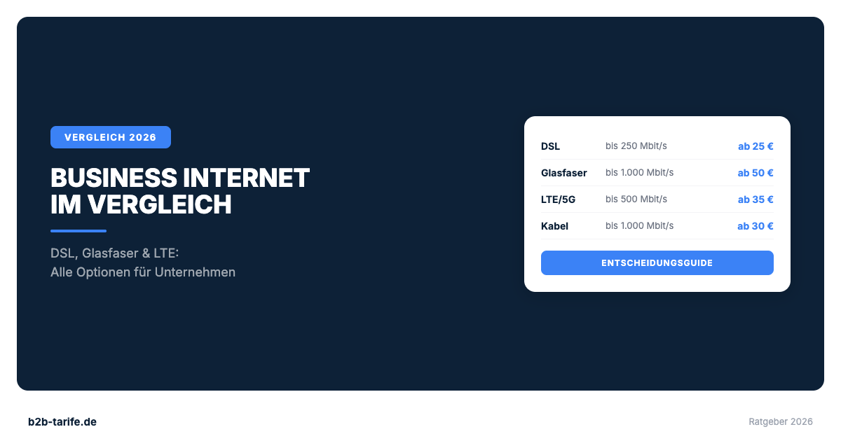 Dieser Vergleich analysiert alle relevanten Internet-Technologien und Anbieter für deutsche Unternehmen: DSL, Glasfaser, LTE/5G als Festnetzalternative und Kabel. Mit konkreten Preisen, Empfehlungen nach Unternehmensgröße und einer klaren Einordnung, wann sich welche Technologie lohnt.
