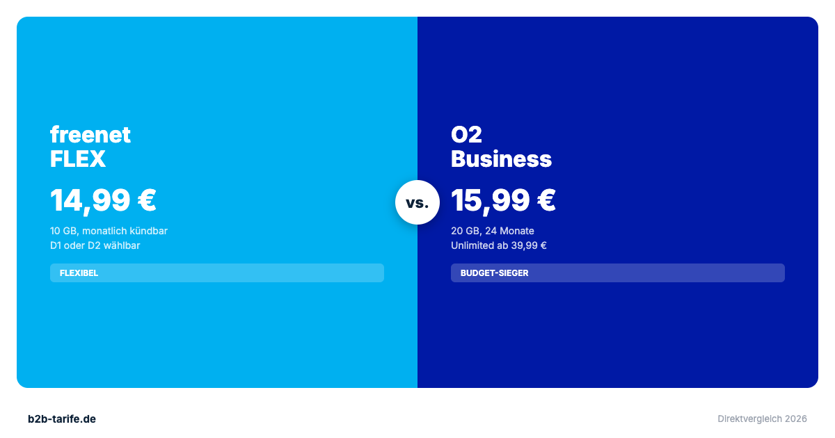 freenet und O2 Business sind keine direkten Konkurrenten, obwohl sie im gleichen Preissegment spielen. freenet gewinnt bei Netzqualität (Telekom D1), Flexibilität (monatlich kündbar) und für kleine Datenpakete. O2 gewinnt bei Datenvolumen, Unlimited-Option, Business-Features und IoT.
