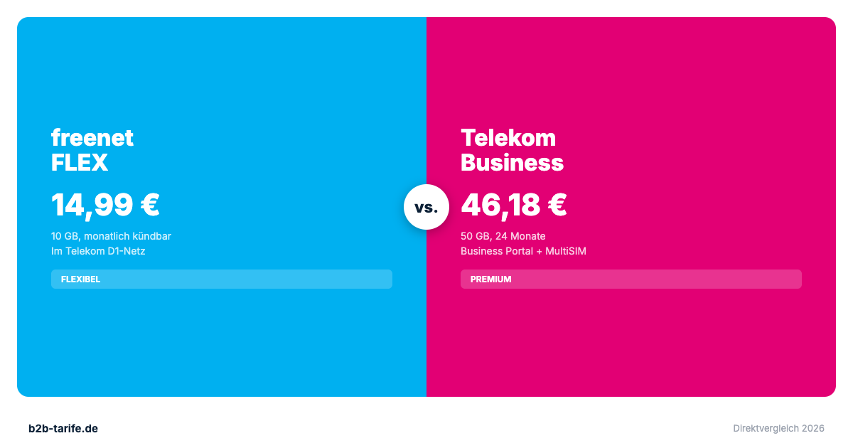 freenet FLEX ab 14,99 Euro vs. Telekom Business Mobil ab 46,18 Euro: Gleiches Netz, verschiedene Features. Wann sich welcher Anbieter lohnt.