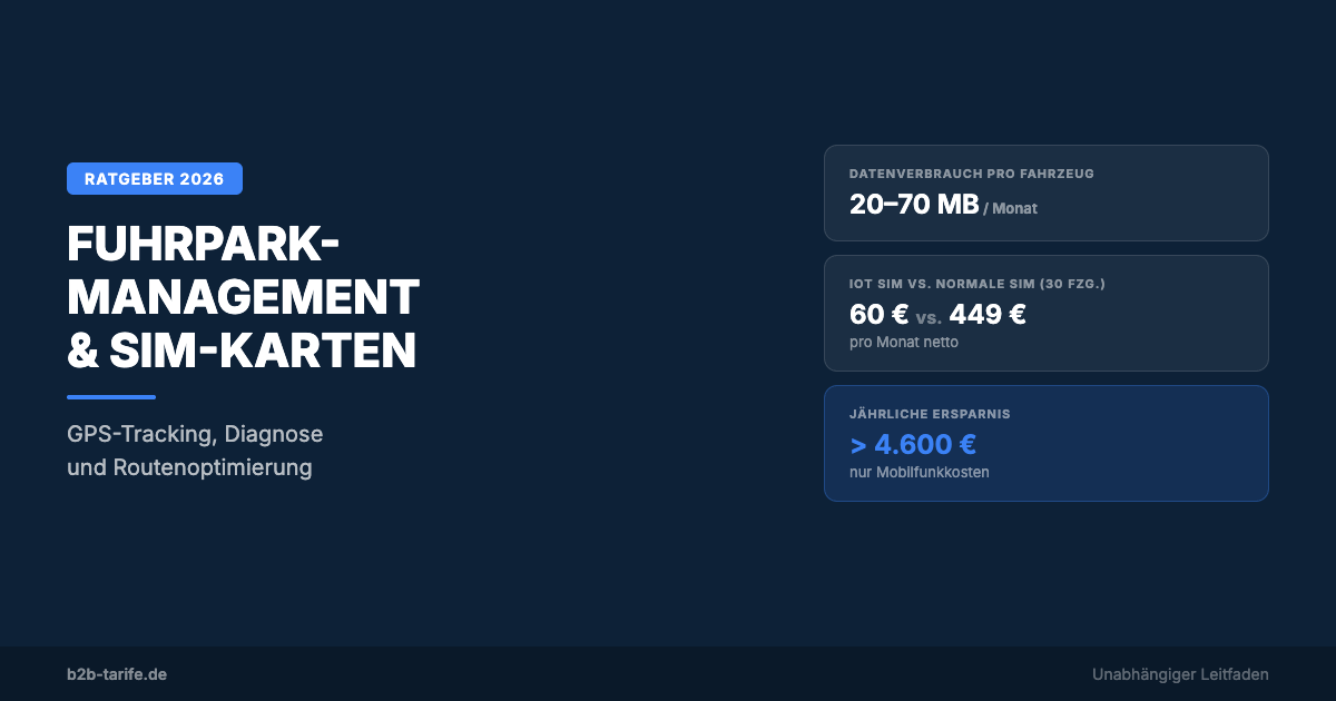 Fuhrparkmanagement ohne Mobilfunkanbindung verschenkt Optimierungspotenzial. Die SIM-Karte ist das Fundament, und mit IoT/M2M SIMs anstelle normaler Business-SIMs sparen Unternehmen mit 30 Fahrzeugen über 4.600 EUR pro Jahr allein bei den Mobilfunkkosten.