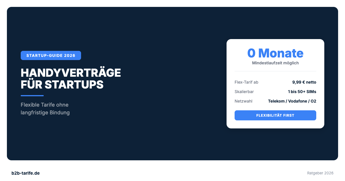 Für Startups gilt eine andere Priorität als für etablierte Unternehmen: Kein Euro ist so teuer wie ein nutzloser 24-Monats-Vertrag für einen Mitarbeiter, der nach 3 Monaten geht. Die monatliche Kündbarkeit hat ihren Preis (ca. 5 bis 10 Euro Aufpreis pro SIM), aber sie gibt Ihnen die Freiheit, schnell zu skalieren und genauso schnell wieder zu reduzieren.