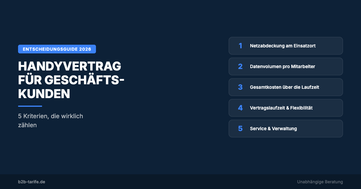 Fünf Kriterien entscheiden, ob ein Handyvertrag zu Ihrem Unternehmen passt: Netzabdeckung, Datenvolumen, Gesamtkosten, Vertragslaufzeit und Service. Dieser Guide zeigt, wie Sie systematisch den richtigen Tarif wählen.