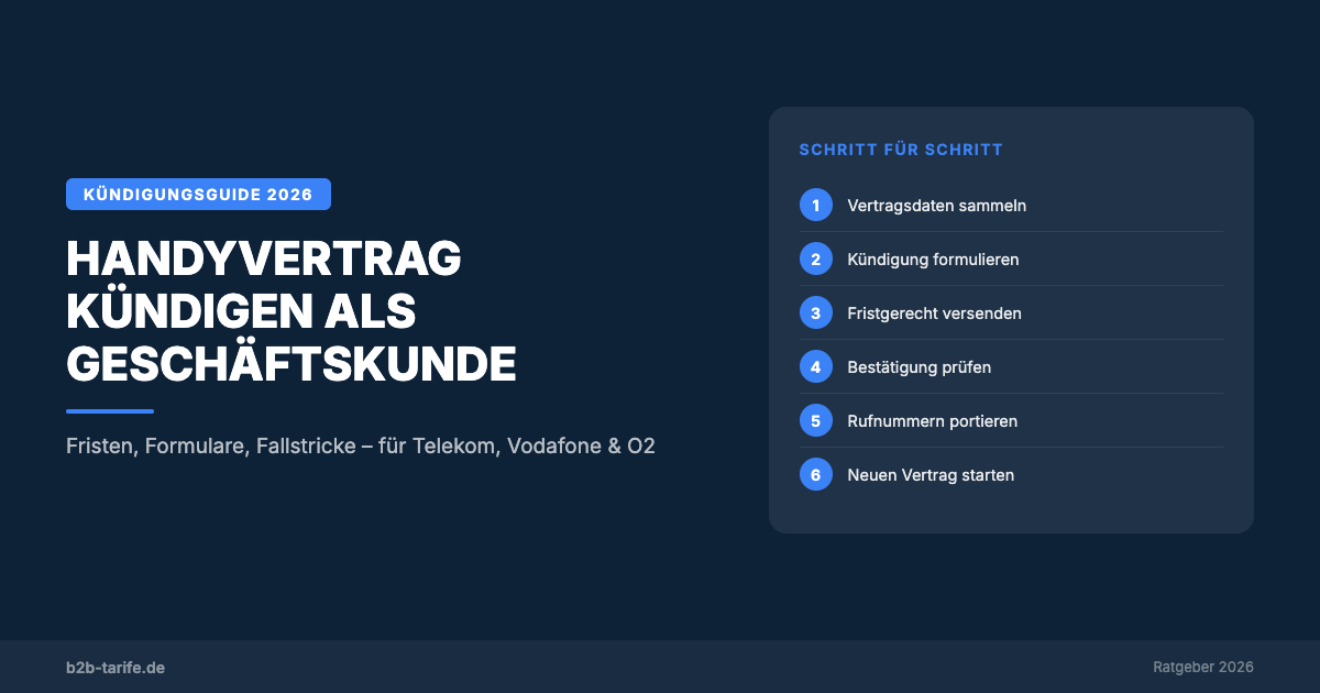 Vollständige Anleitung zur Kündigung von Geschäftskunden-Mobilfunkverträgen. Fristen bei Telekom, Vodafone und O2, Kündigungsvorlage und häufige Fehler.