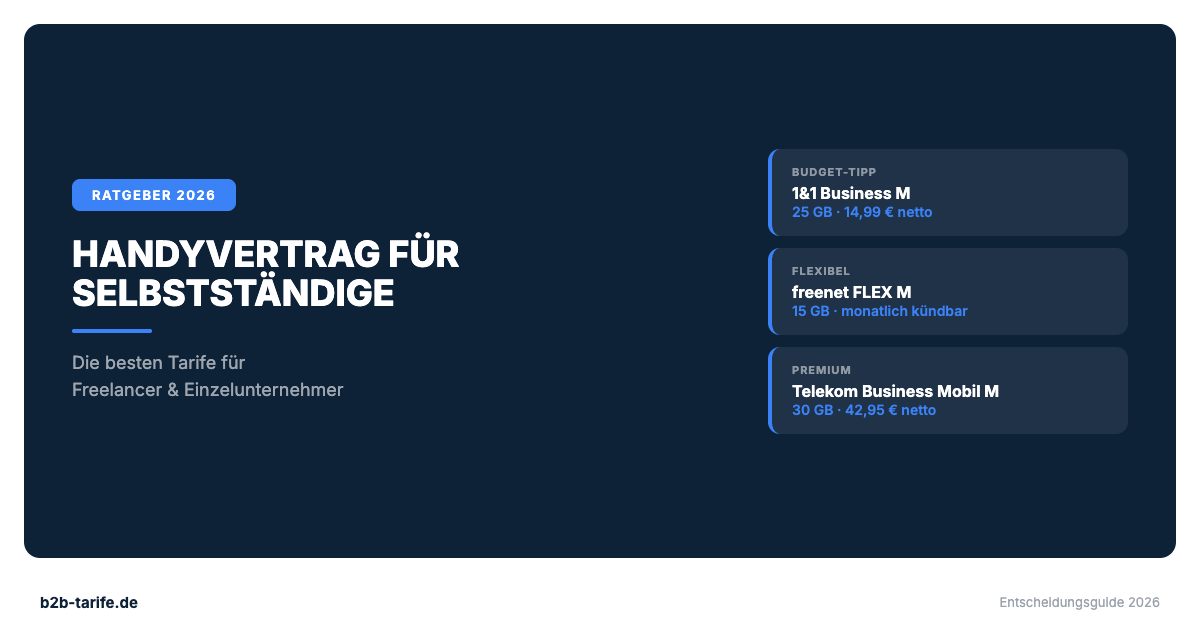 Für die meisten Selbstständigen empfehlen wir den 1&1 Business M (25 GB, ca. 14,99 Euro netto) als Preis-Leistungs-Sieger oder den freenet FLEX M (15 GB, monatlich kündbar) für maximale Flexibilität. Wenn Netzabdeckung entscheidend ist, greifen Sie zum Telekom Business Mobil M, zahlen aber ca. 42,95 Euro netto.