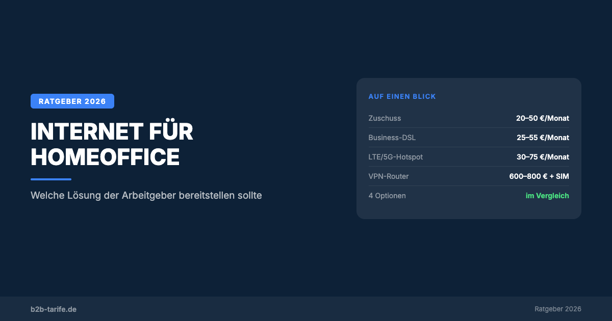 Zuschuss: 20 bis 50 Euro/Monat. Business-DSL: 25 bis 55 Euro/Monat. LTE/5G-Hotspot: 30 bis 75 Euro/Monat. VPN-Router + SIM: 30 bis 80 Euro/Monat + einmalig 600 bis 800 Euro Hardware. Für die meisten Unternehmen ist der Zuschuss von 30 Euro/Monat der kosteneffizienteste Ansatz.