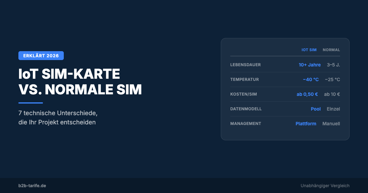 IoT SIM-Karten unterscheiden sich von normalen SIM-Karten in 7 entscheidenden Punkten: Robustheit, Lebensdauer, Tarifstruktur, Formfaktor und zentrales Management. Ab 10 Geräten lohnt sich der Wechsel.