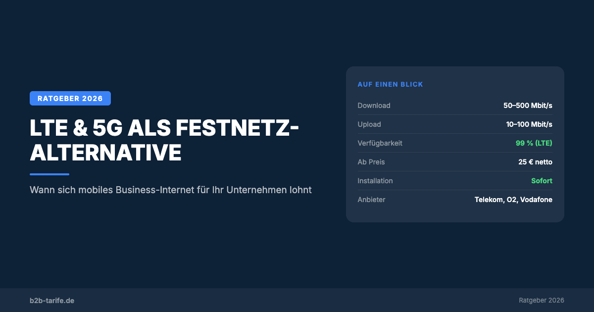 Leitfaden zu LTE und 5G als Festnetz-Alternative für Unternehmen. Tarife, Hardware, Grenzen und Empfehlungen nach Einsatzszenario.