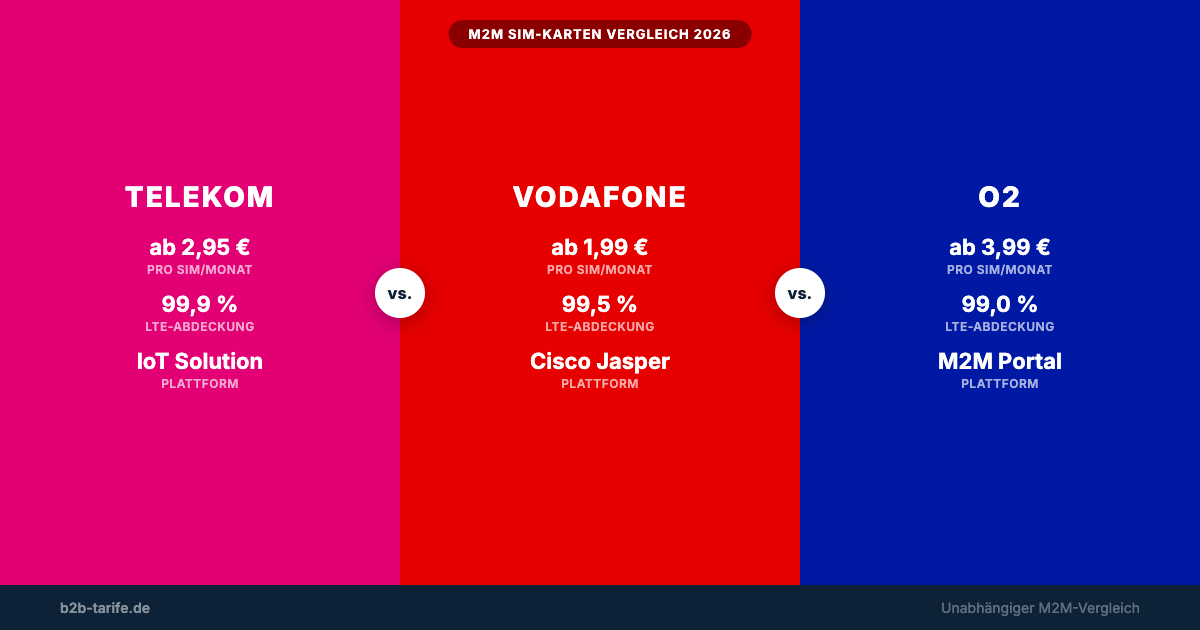 Bei kleinen Projekten (unter 50 SIMs) ist Vodafone der preisliche Gewinner. Bei Großprojekten (200+ SIMs) bietet O2 die aggressivsten Preise. Die Telekom ist durchgehend am teuersten, rechtfertigt den Aufpreis aber mit Netzabdeckung und Plattformqualität.
