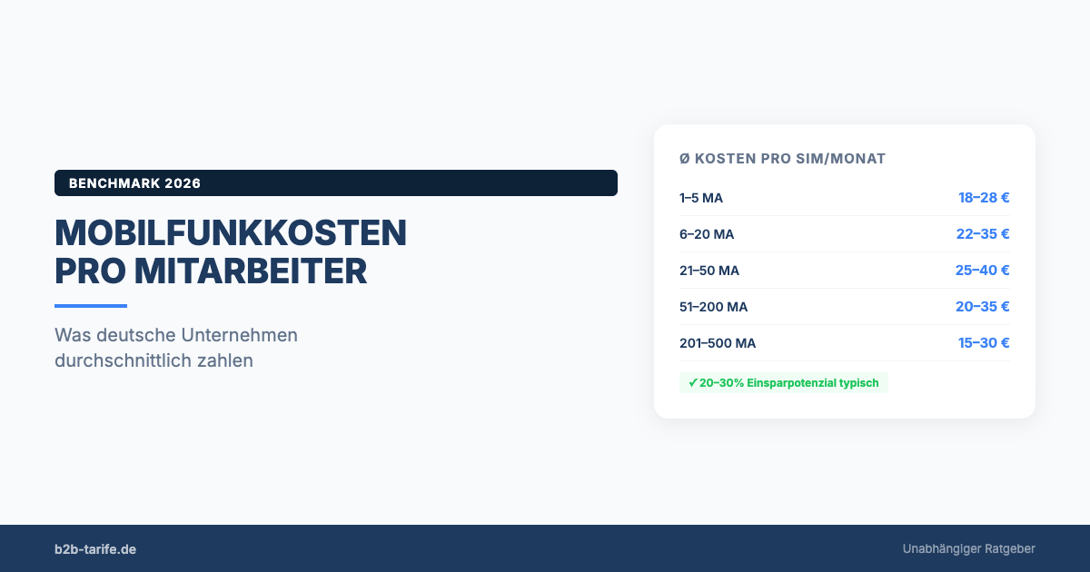 Der Mobilfunk-Kosten-Benchmark für deutsche KMU liegt bei 25 bis 35 Euro netto pro SIM und Monat. Wenn Ihr Wert darüber liegt, sind veraltete Tarife, fehlende Rahmenverträge oder der falsche Provider die wahrscheinlichsten Ursachen.