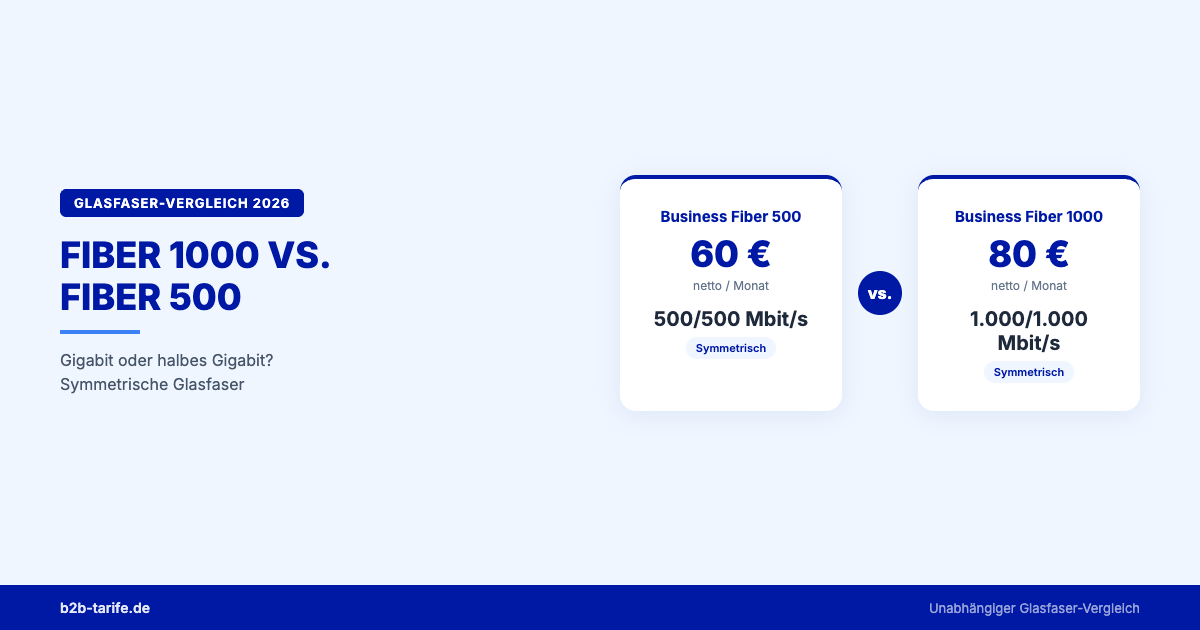 500 Mbit/s symmetrisch fuer 59,99 Euro oder 1.000 Mbit/s symmetrisch fuer 79,99 Euro. Beide O2-Glasfasertarife liefern, was DSL physikalisch nicht kann: echten symmetrischen Upload. Der Preisunterschied von 20 Euro pro Monat verdoppelt die Bandbreite in beide Richtungen. Die Frage ist nicht, ob Gigabit besser ist (natuerlich ist es das), sondern ob Ihr Unternehmen den Unterschied tatsaechlich spuert.