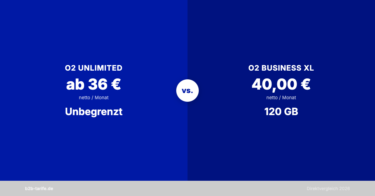 O2 Business Unlimited (ab 36 €) vs XL (120 GB, 40 €): Speed-Stufen, Volumen und Empfehlung.