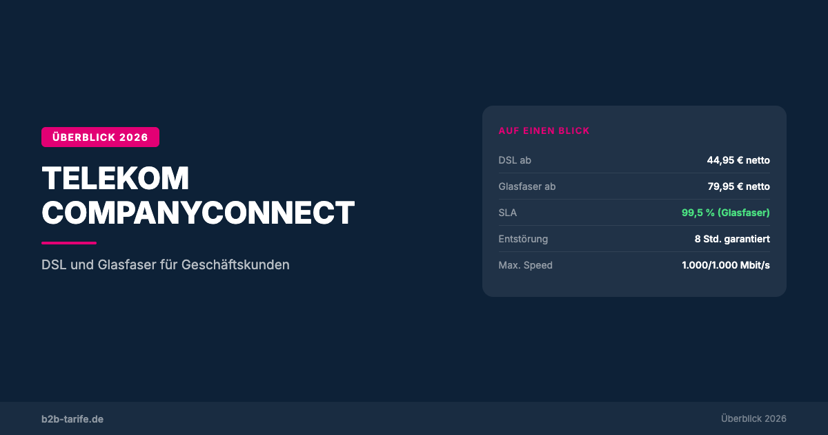 Telekom CompanyConnect ist die richtige Wahl für Unternehmen, die auf das SLA und die Telekom-Infrastruktur Wert legen. Für preisbewusste KMU ohne geschäftskritische Verfügbarkeitsanforderungen bieten O2 und 1&1 bessere Preis-Leistung bei vergleichbarer Bandbreite.