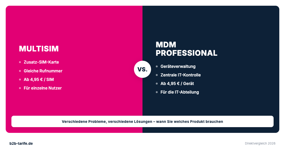 Ein Vertriebsleiter hat Smartphone und Tablet. Er will auf beiden Geräten unter derselben Nummer erreichbar sein. Sein IT-Leiter will alle 30 Firmenhandys zentral verwalten, Sicherheitsrichtlinien durchsetzen und Apps verteilen. Beide wenden sich an die Telekom. Der Vertriebsleiter braucht MultiSIM. Der IT-Leiter braucht MDM Professional. Zwei komplett verschiedene Produkte, die oft verwechselt werden.