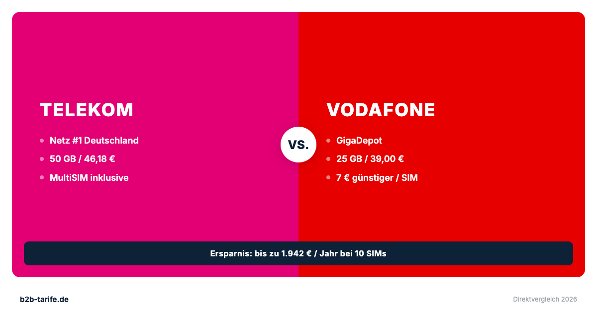 Die drei wichtigsten Unterschiede: (1) Telekom bietet Business Cards ab 11,33 Euro für zusätzliche Team-SIMs, Vodafone nicht. (2) Vodafone hat GigaDepot (Datenübertrag), Telekom nicht. (3) Telekom hat das umfassendere IoT- und Festnetz-Portfolio (CompanyConnect, Fleet Connect, MDM).