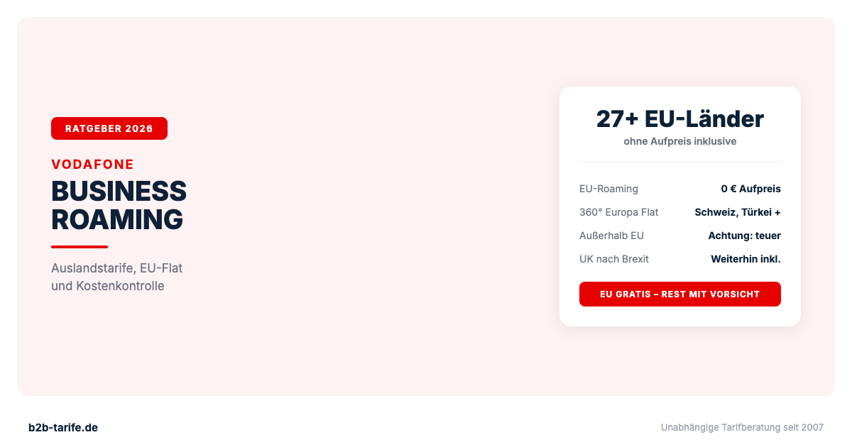 Die EU-Roaming-Verordnung enthält eine Fair-Use-Regelung: Bei dauerhafter Nutzung im Ausland (mehr als 4 Monate durchgehend im EU-Ausland) kann Vodafone Aufschläge erheben. Für normale Geschäftsreisen (auch häufige) ist das kein Thema. Die Regelung richtet sich gegen permanente Nutzung ausländischer SIM-Karten.