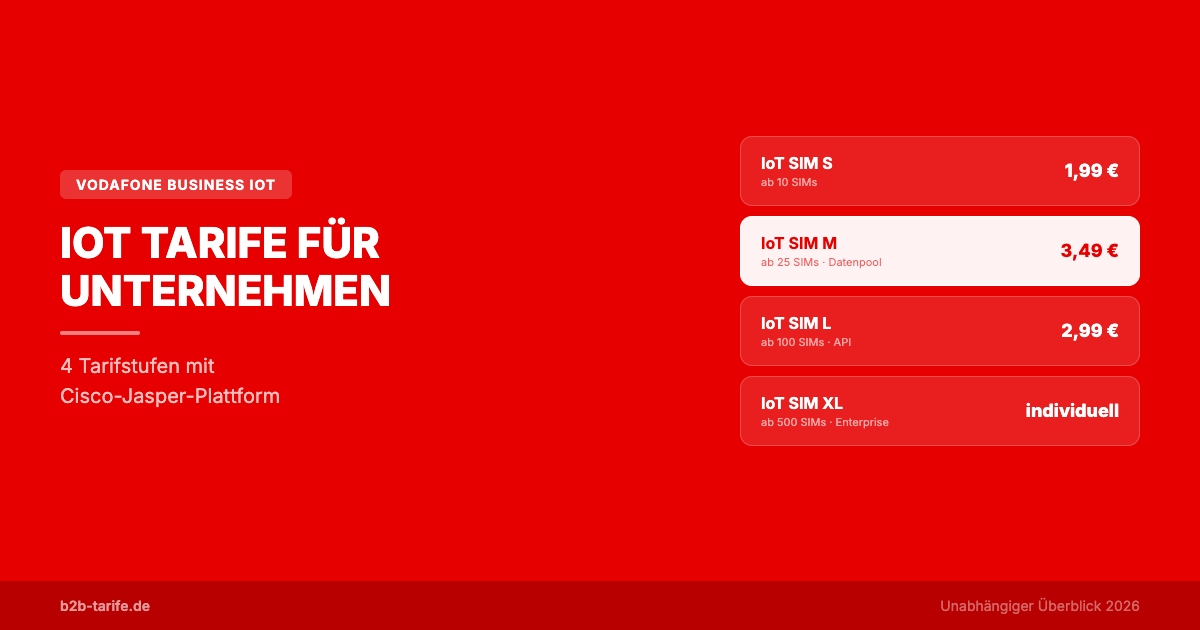 Vodafone bietet vier IoT-Tarifstufen für Geschäftskunden: Von IoT SIM S ab 1,99 EUR bis zum Enterprise-Tarif IoT SIM XL. Alle Preise, Datenpools und die Cisco-Jasper-Plattform im Überblick.