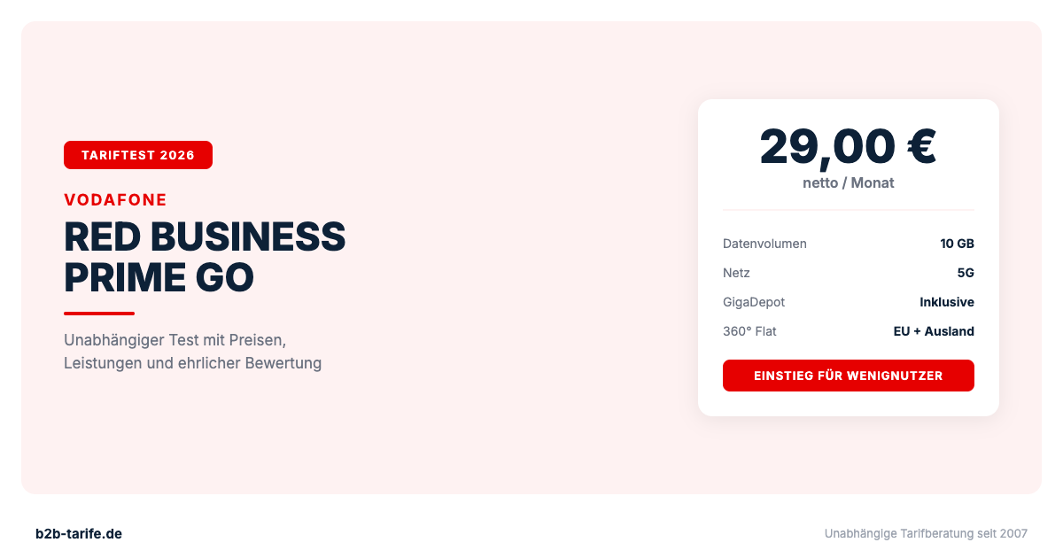 Vodafone Red Business Prime Go im Test: 10 GB für 29 € netto mit GigaDepot, 5G und 360° Europa Flat. Lohnt sich der Einstiegstarif? Ehrliche Bewertung mit Alternativen.