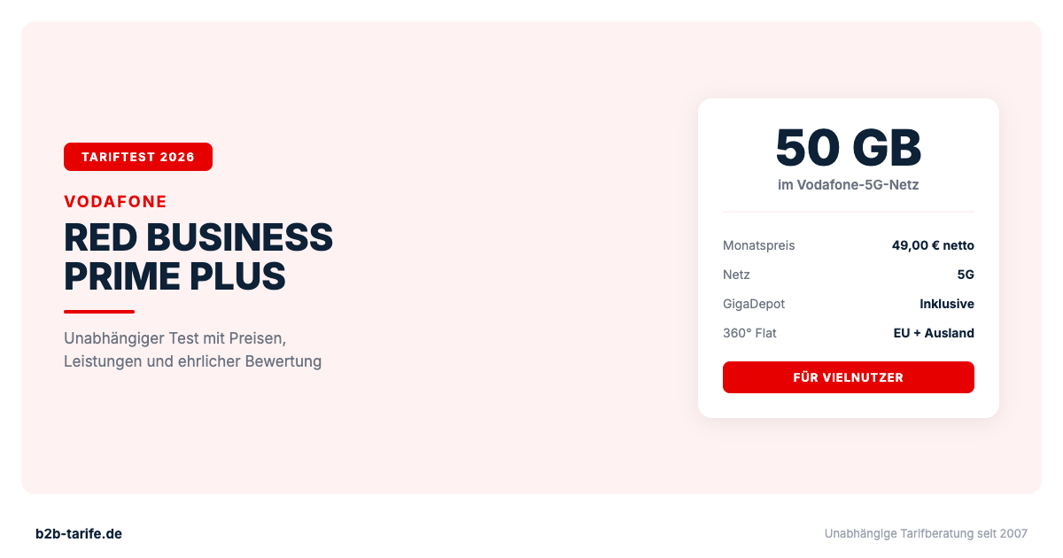 Der Vodafone Red Business Prime Plus ist ein solider 50-GB-Tarif für Mitarbeiter, die viel unterwegs sind und auf das Vodafone-Netz setzen. Das GigaDepot macht ihn flexibler als vergleichbare Telekom-Tarife. Der Preis (49 Euro netto) ist allerdings nur dann gerechtfertigt, wenn Sie tatsächlich regelmäßig mehr als 30 GB verbrauchen und das Vodafone-Netz an Ihren Standorten brauchen.