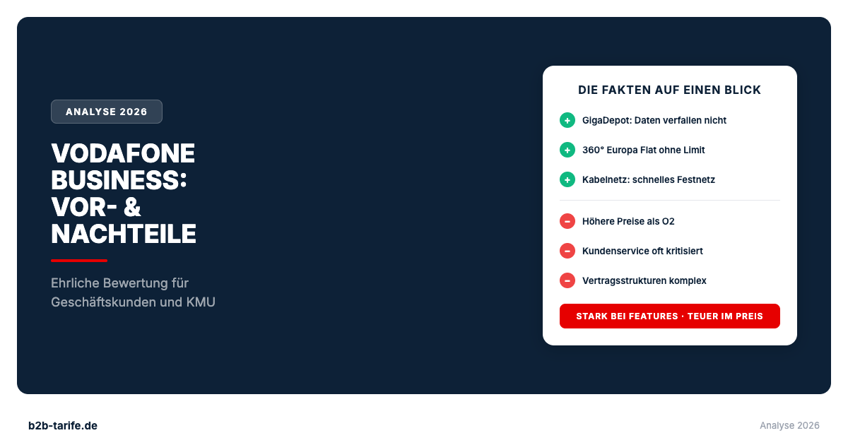 Vodafone Business ehrlich bewertet: Alle Vorteile (GigaDepot, 360 Grad Europa Flat, Kabelnetz) und Nachteile (24-Monats-Bindung, kein Online-Abschluss, schwaecher auf dem Land). Plus Vergleich mit Telekom und O2.